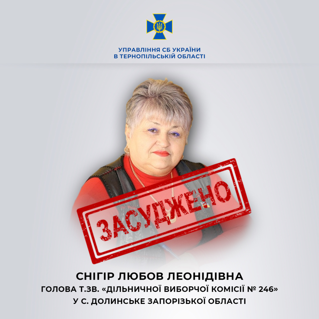 Мова йде про ексголову Фруктівської сільської ради Любов Снігір, яка, як встановило слідство, після захоплення росіянами Мелітопольського району Запорізької області пристала на пропозицію загарбників та добровільно погодилася допомагати окупантам у проведенні фейкового «референдуму», організованого росіянами з метою незаконної зміни меж території та державного кордону України.