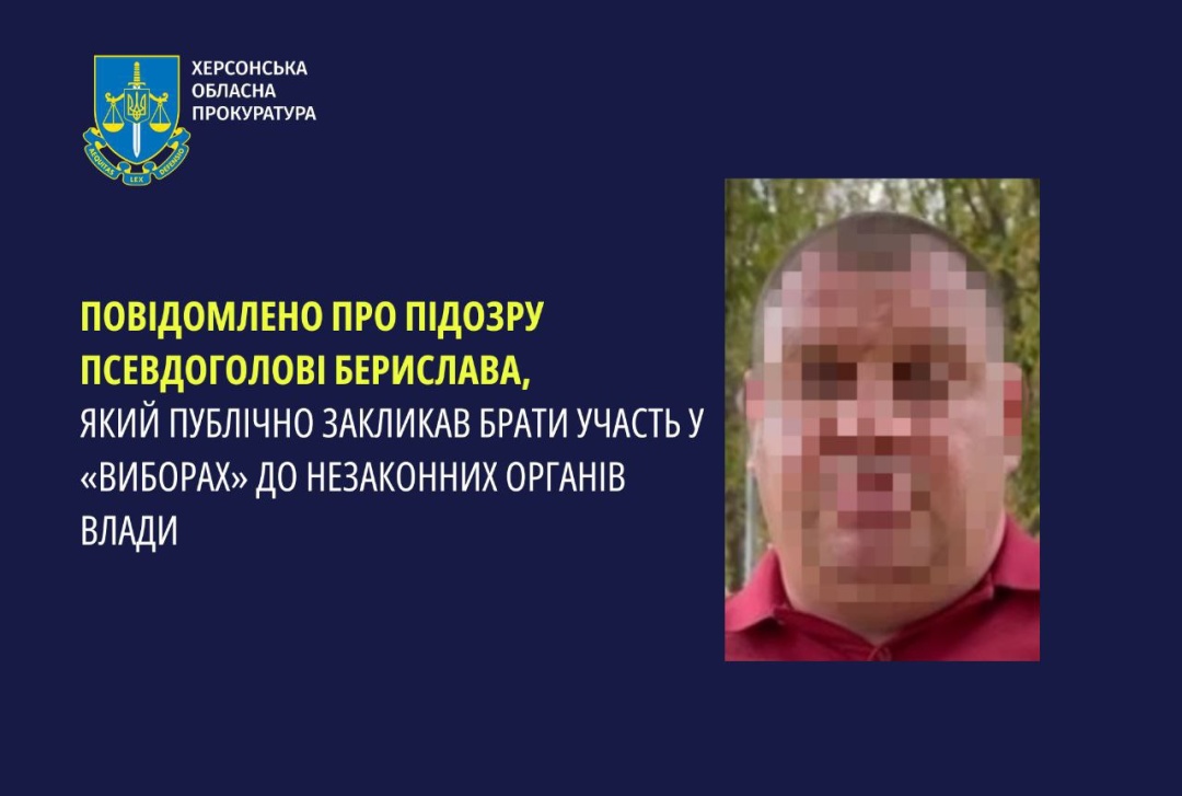За даними слідства, 42-річний підозрюваний обіймав псевдопосаду так званого «главы военно-гражданской администрации Бериславского муниципального округа». Перебуваючи на окупованій території, у 2023 році напередодні проведення «виборів» до незаконних органів влади, він виступив із публічними закликами прийти на «дільниці» та «зробити свій вибір».