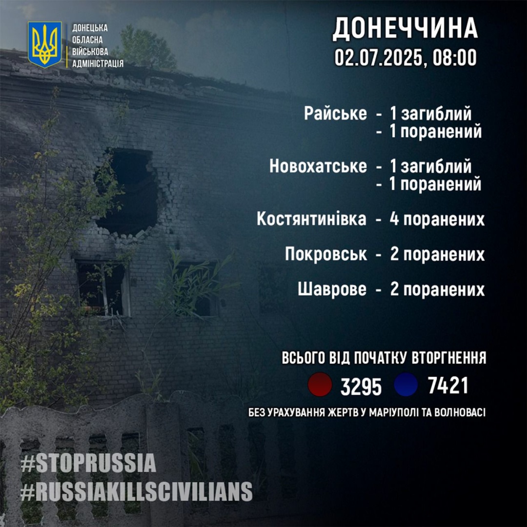 Як повідомляв Укрінформ, 1 липня війська РФ обстріляли житлову забудову Костянтинівки на Донеччині, поранені троє людей.