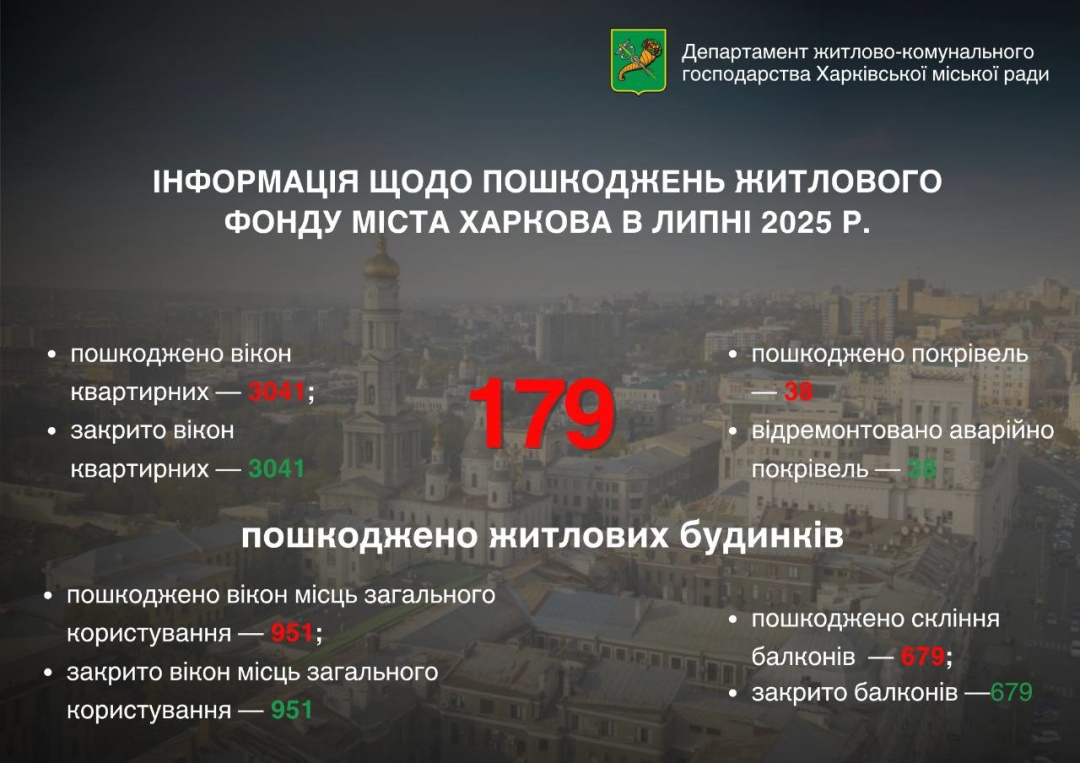 «У липні ворожі обстріли пошкодили 179 житлових будинків. У квартирах та у приватному секторі було вибито 4671 вікно. Всі вони тимчасово закриті ОСБ-плитами. Ремонти дахів, які зазнали пошкоджень, виконані на 100%», - зазначив Терехов.