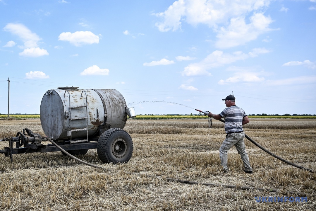 ПОКИ ПРАЦЮЮТЬ КОМБАЙНЕРИ, ЧЕРГУЄ ТРАКТОР ІЗ БОЧКОЮ З ВОДОЮ