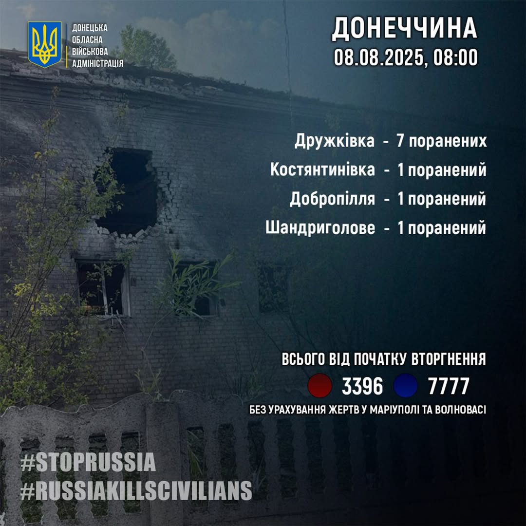 За 7 серпня росіяни поранили 10 жителів Донеччини - у Дружківці, Костянтинівці, Добропіллі і Шандриголовому.
