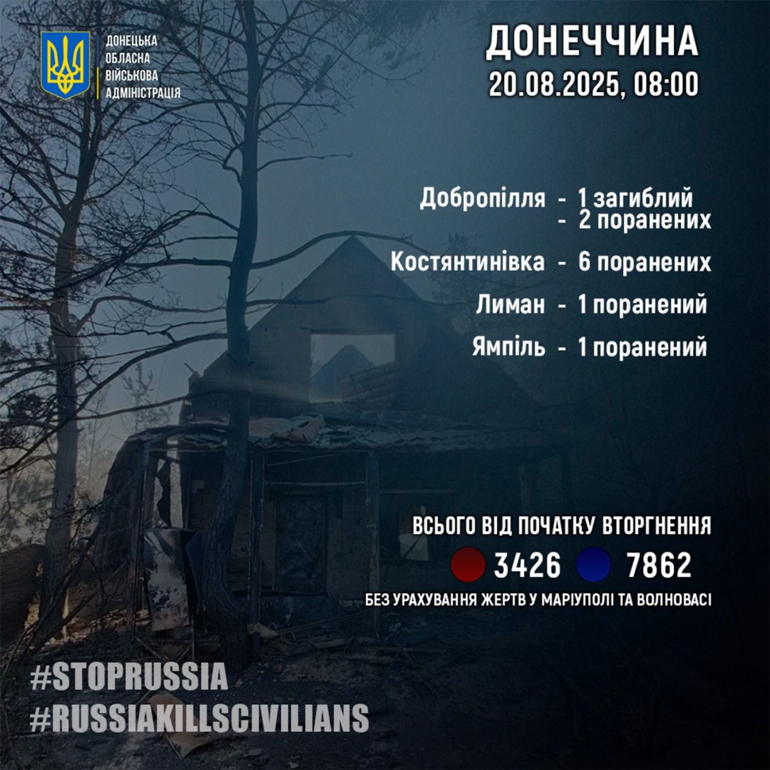 За його словами, 19 серпня росіяни вбили одну людину в Добропіллі. Ще 10 людей на Донеччині дістали поранення.