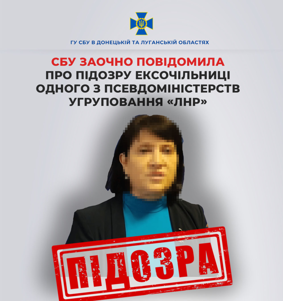 «Служба безпеки зібрала доказову базу щодо чергової зрадниці, яка добровільно співпрацювала з російськими окупантами у складі так званого «уряду ЛНР». Встановлено, що мешканка тимчасово окупованого Луганська з початку повномасштабної агресії РФ підтримувала загарбників та обіймала керівні посади в окупаційному «мінекономрозвитку ЛНР», - ідеться в повідомленні.
