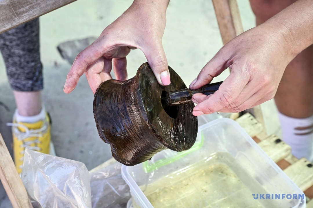 Поки ми робили фото та спілкувалися з археологами, вони знайшли біля судна підошву від якогось взуття. Судячи з тих залишків інформації, що збереглися на підошві, виготовлене воно було за Радянського союзу і за стандартами того часу. Ларрі пояснює, що їхнє завдання – все сфотографувати, розібрати і законсервувати. Співробітниця заповідника на імʼя Поліна старанно прибирає бруд із деревʼяних дощок судна. Її колега поливає їх водою, бо через спеку дерево швидко сохне і тріскається.