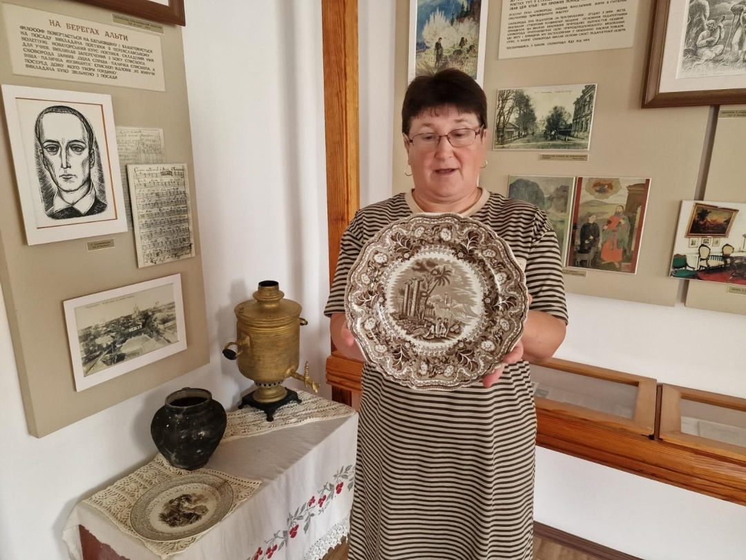 - Речей, безпосередньо пов’язаних зі Сковородою, у нас, звичайно, немає, але речі XVIII століття є. Ну, наприклад, ось ця тарілка з маєтку Томар. Її подарував своїй служниці Степан Томара. У селі є ще одна така тарілка. Люди бережуть її, кажуть, тільки на Великдень ставлять. Ось цю вони нам дали, а іншу в себе зберігають.
