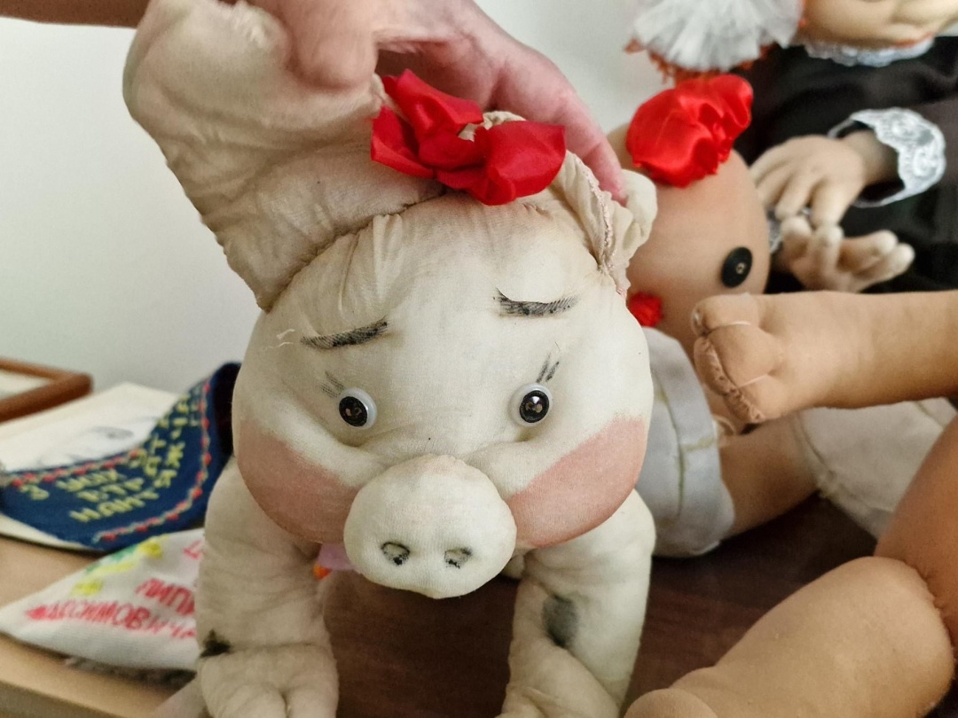 - Суть у чому. Різні техніки виготовлення. Там – бісер, тут – синтепон. Там – вишивка, там – малюнок. Дуже різні техніки. На день народження Сковороди колись ми проводили фестиваль, який називався De libertate. Проводили майстер-класи з виготовлення ляльок-мотанок – бачите, скільки їх. Це ті, що діти залишили для музею. Техніка виготовлення картин – з манки й маку. Ось цікаве – вірші, написані в Ковраї. Це також діти на конкурс робили. Звичайно, малюнки до байок. Сам Сковорода, якого учні малювали. Бачите: вміло намальований. Досконалий, можна сказати. Витинанки… всього в нас 13 технік, якими володіють вчителі. Це ж непроста робота, це ж кожну дірочку треба вирізати…