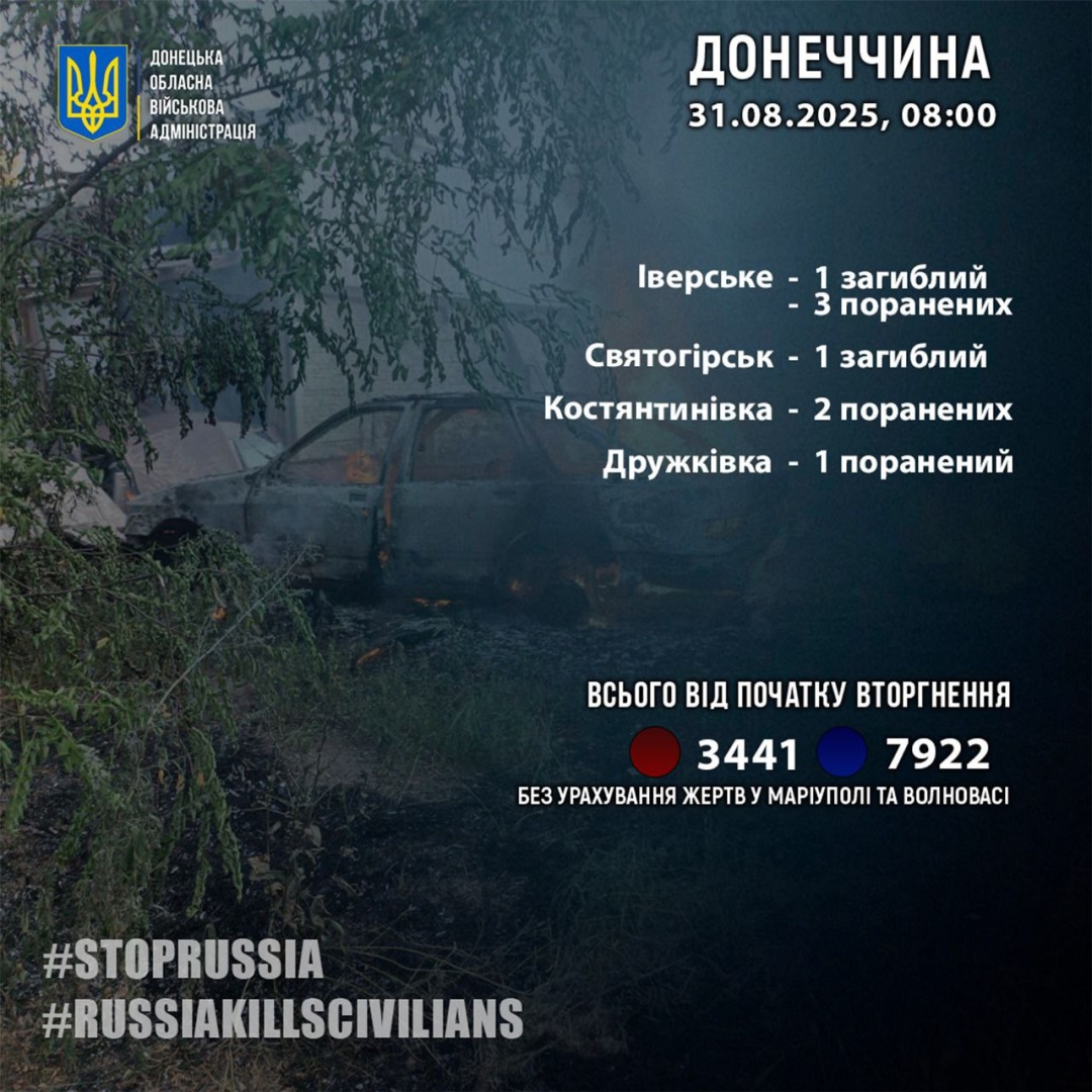 "За 30 серпня росіяни вбили 2 жителів Донеччини: у Святогірську та Іверському. Ще 6 людей в області за добу дістали поранення", - йдеться у повідомленні.
