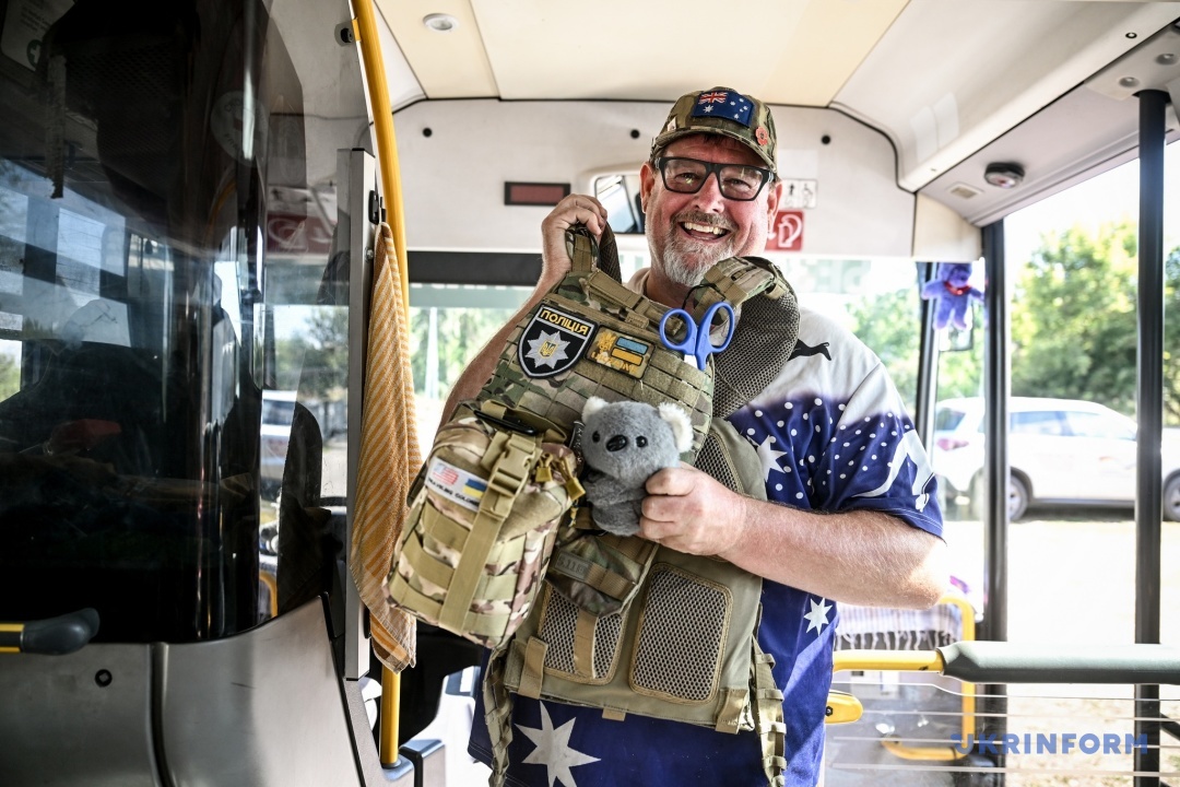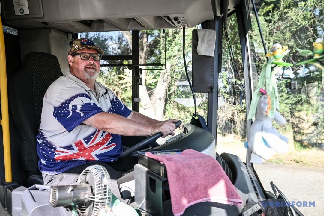 Водій автобуса – австралієць, якого звати Скотт. Він дуже позитивний і дуже любить Україну. Розповів, що був тут у 2022-2023 рр. і зараз знову повернувся.