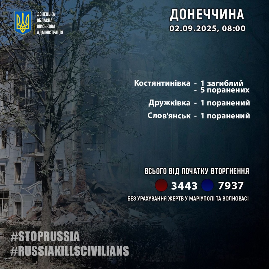 За його словами, 1 вересня росіяни вбили одну людину в Костянтинівці. Ще семеро людей в області за добу дістали поранення.