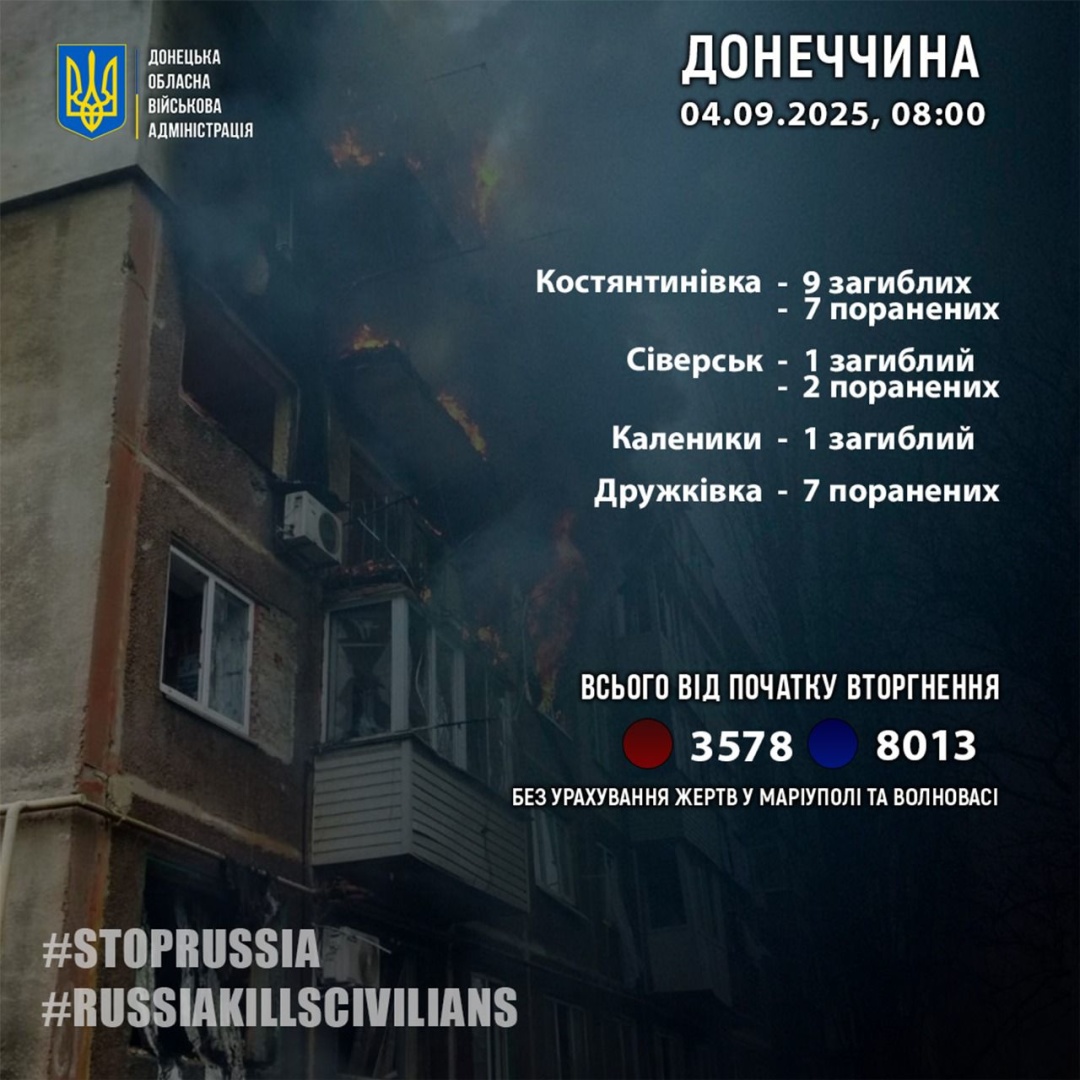 Як повідомляв Укрінформ, у місті Костянтинівка на Донеччині унаслідок російських артилерійських і дронових атак 3 вересня загинули дев'ятеро людей, ще семеро поранені.