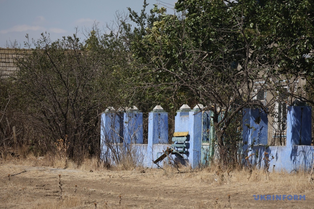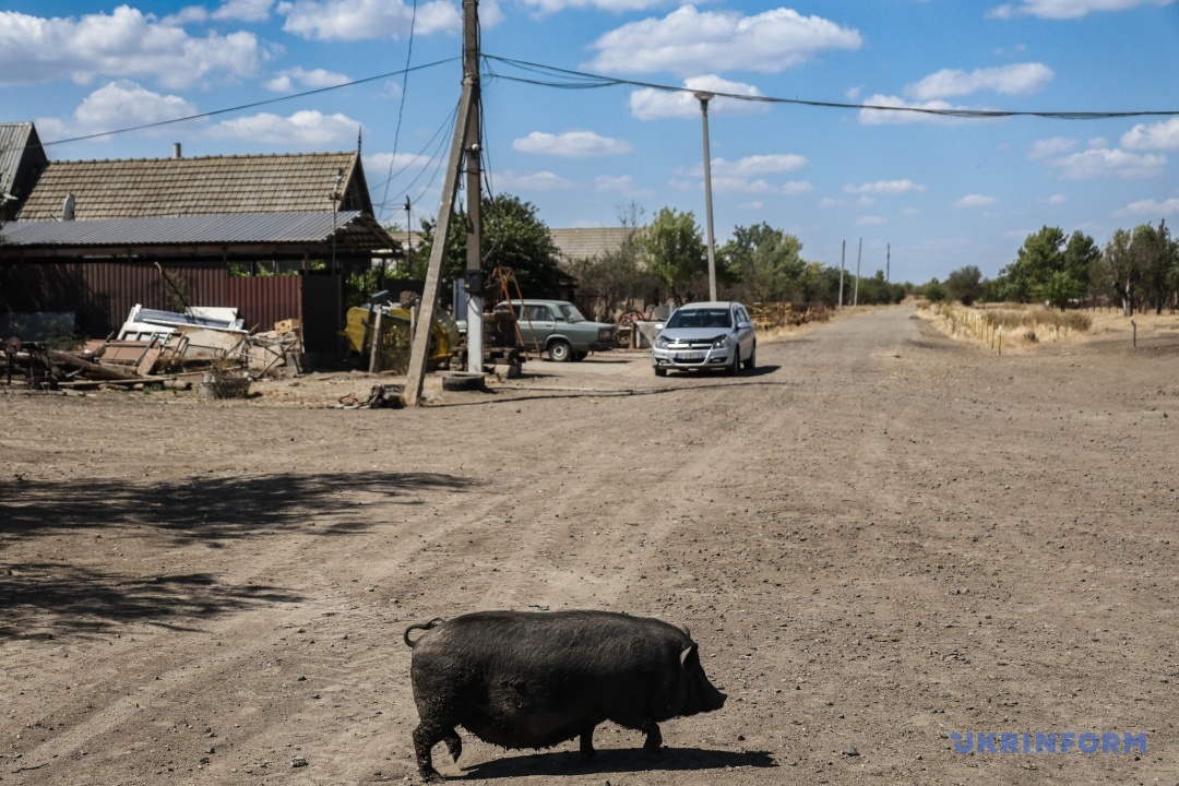 По обидва боки ґрунтової дороги – старенькі похилені хати. Від деяких залишилося тільки по кілька стін. На косих стовпах хвилями нависають проводи, вуличних ліхтарів немає. Такі пейзажі ми бачили у прифронтових селах Херсонщини, але Лиману війна напряму не торкалася. Спершу село здається повністю вимерлим, аж раптом прямо під колеса до нас вибігає маленьке чорне порося. Гальмуємо – ми на місці.