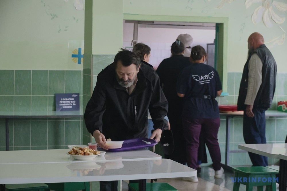 З пенсіонеркою Вірою Іванівною з Костянтинівки спілкуємось у їдальні. В транзитному центрі вона перебуває третю добу. Жінка взяла обід і, сівши за стіл навпроти вікна видачі, все продовжує дякувати кухарям за смачну страву. Приготувати гаряче самостійно вона не мала змоги вже кілька тижнів.