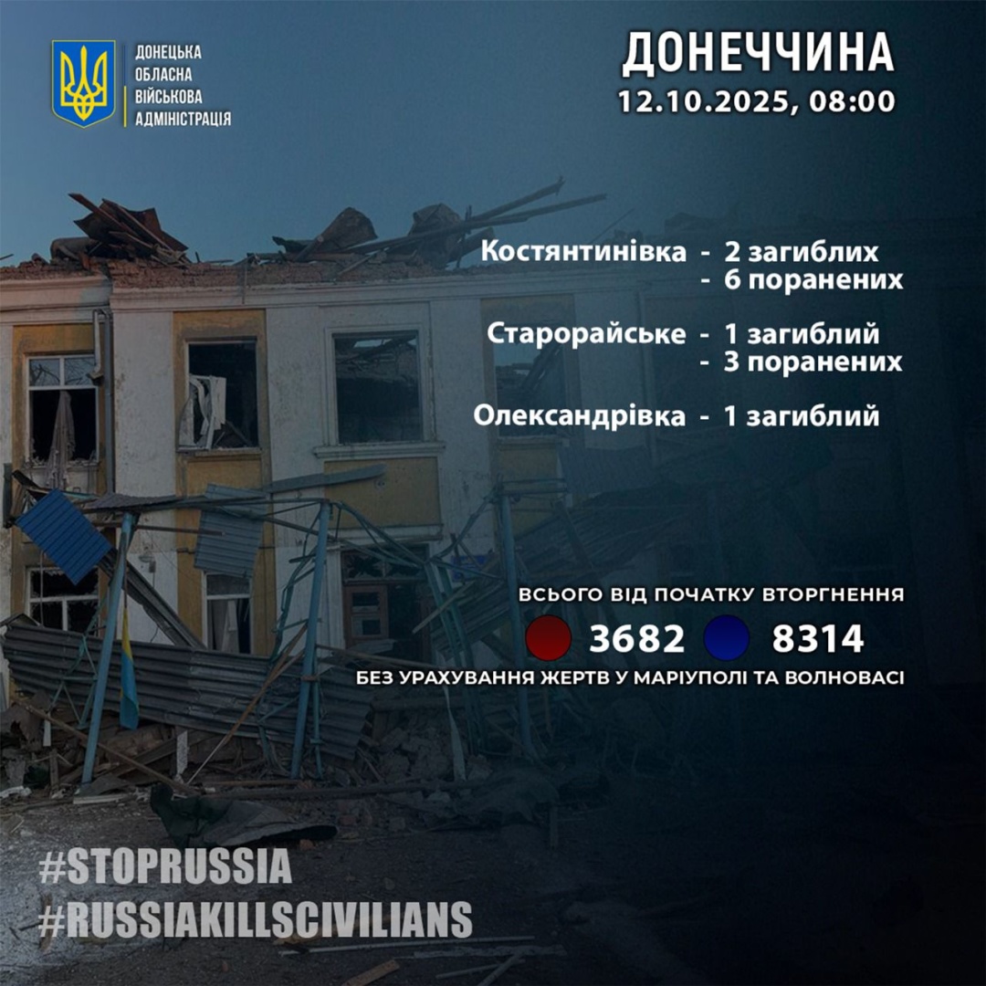 "За 11 жовтня росіяни вбили 4 жителів Донеччини: 2 у Костянтинівці, по 1 у Старорайському та Олександрівці. Ще 9 людей в області за добу дістали поранення", - йдеться у повідомленні.