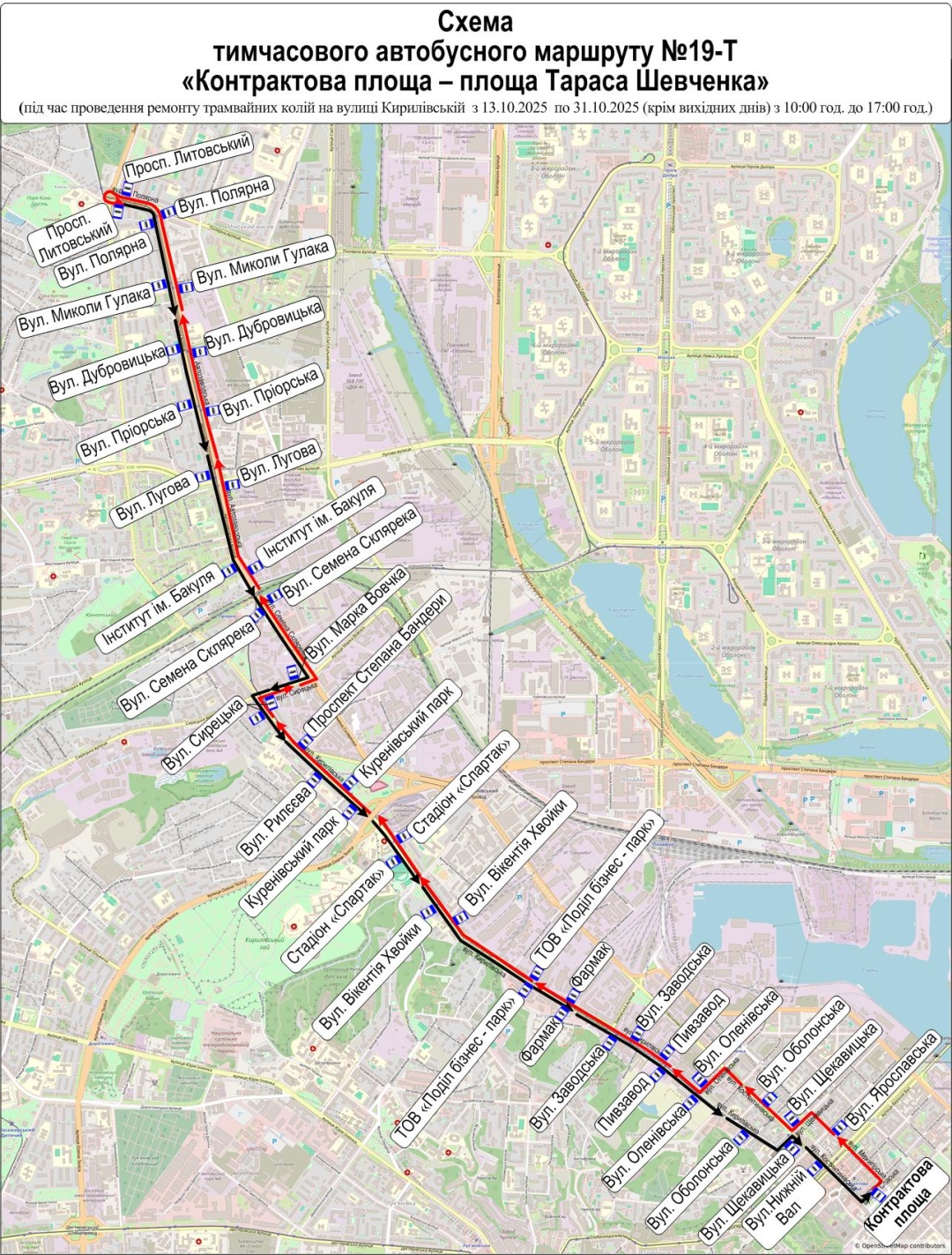 Також для перевезення пасажирів від Контрактової площі до площі Тараса Шевченка буде організований тимчасовий автобусний маршрут № 19-Т: