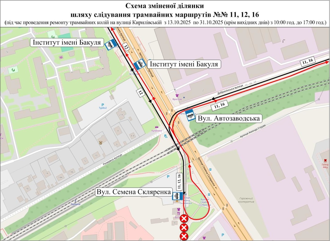 Зокрема, в будні дні, з 10:00 до 17:00, рух трамваїв маршрутів №№ 11, 12, 16 буде організований відповідно від вулиці Йорданської, Пущі-Водиці та станції метро «Героїв Дніпра» до вулиці Семена Скляренка, а маршруту № 19 – від Контрактової площі до зупинки «Стадіон «Спартак».