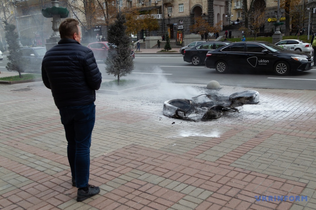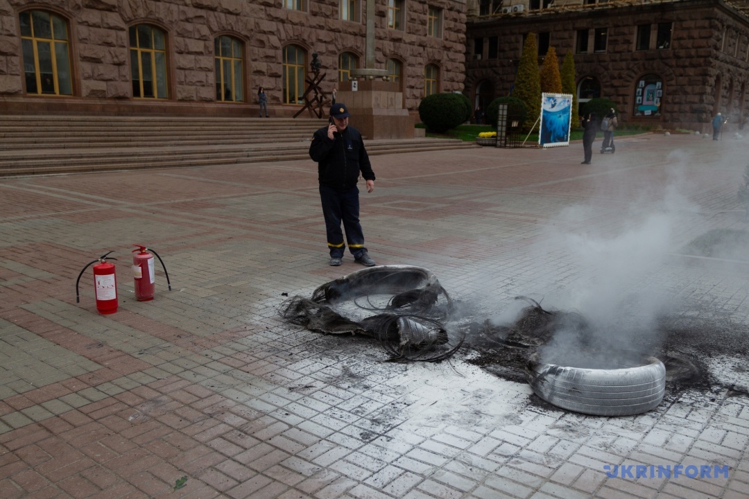 Правоохоронці затримали громадянина, причетного до підпалу автомобільних шин біля адміністративної будівлі на вулиці Хрещатик у Києві.