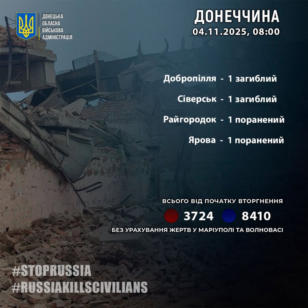 За 3 листопада поліція зафіксувала 1 476 ворожих ударів по лінії фронту та житловому сектору регіону. Руйнувань зазнали 54 цивільних об’єкти, з них 41 житловий будинок.