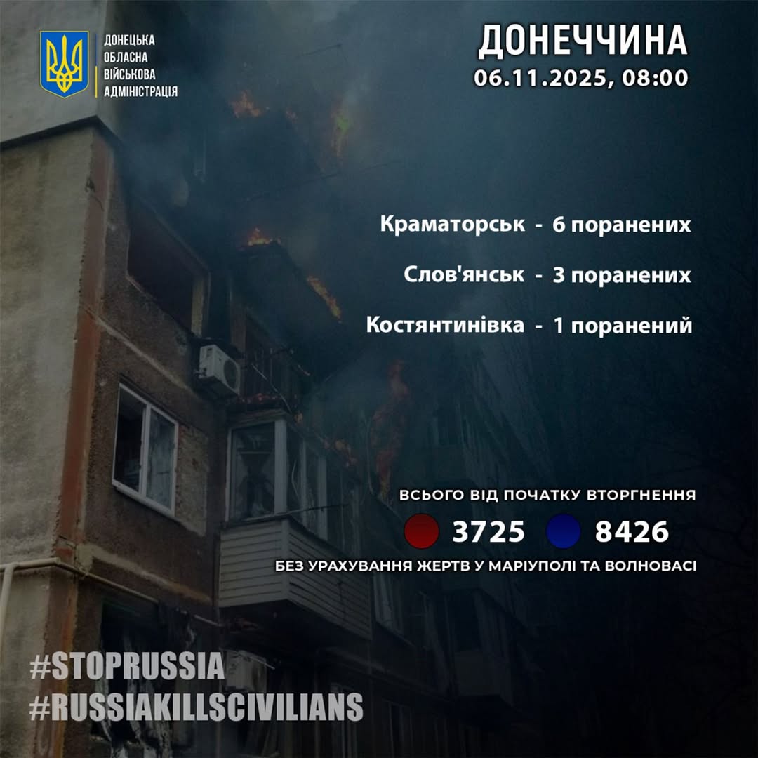 Поліція уточнила, що протягом 5 листопада війська РФ завдали 1755 ударів по лінії фронту та житловому сектору регіону. Під вогнем перебували 11 населених пунктів: міста Добропілля, Дружківка, Костянтинівка, Краматорськ, Миколаївка, Слов’янськ, селище Олексієво-Дружківка, села Гришине, Іллінівка, Надія, Новомиколаївка.