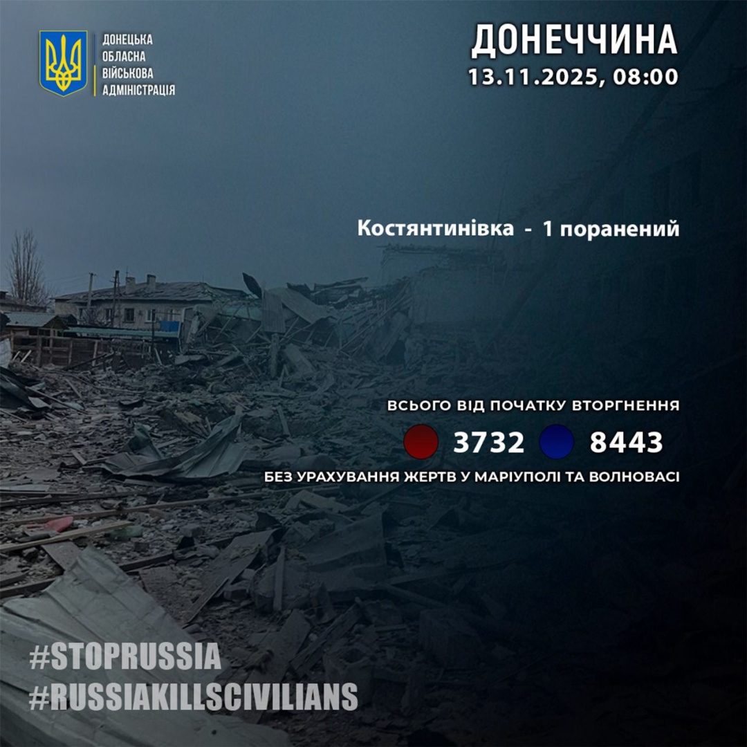 Зокрема, по Костянтинівці війська РФ вдарили бомбою «КАБ-500», FPV-дронами, артилерією, у результаті поранили цивільну особу, зруйнували багатоповерховий будинок.