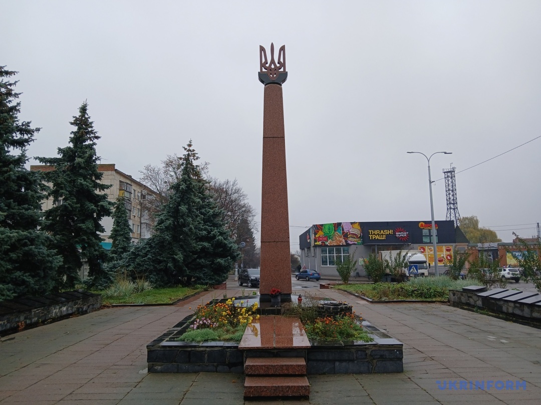 Навпроти – Алея Слави з портретами загиблих у російсько-українській війні земляків та декомунізований постамент, вгорі якого розміщений тризуб. А от поруч є пам’ятний знак, присвячений партизанам, де досі розміщена зірка. Сергій згадує, як на цьому місці поруч із Державним прапором важко приживався червоно-чорний, який неодноразово знімали.