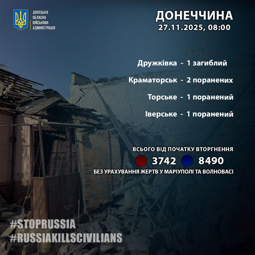 За його словами, росіяни вбили одну людину у Дружківці. Ще четверо людей в області дістали поранення - у Краматорську, Торському та Іверському.