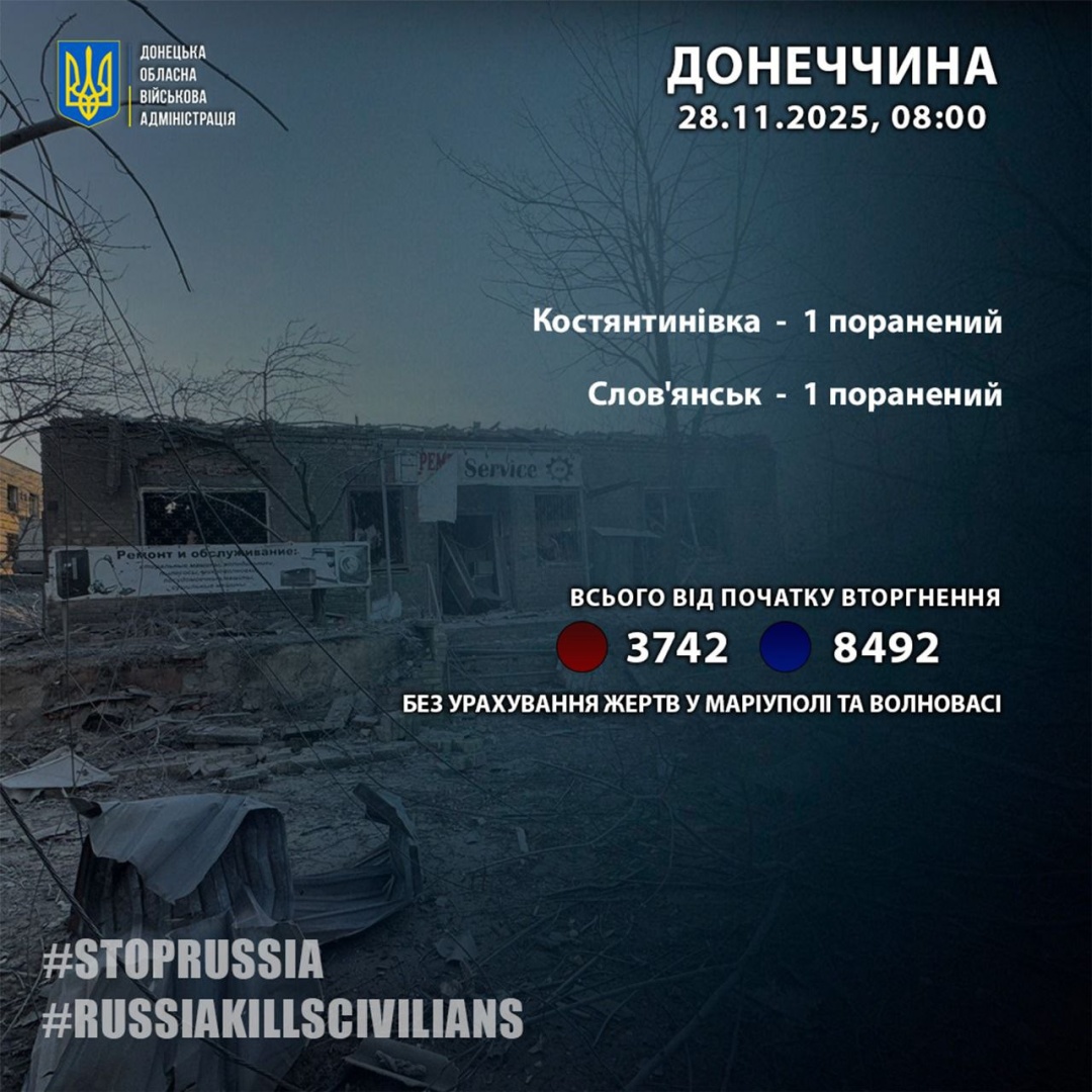 "За 27 листопада росіяни поранили 2 жителів Донеччини", - йдеться у дописі.
