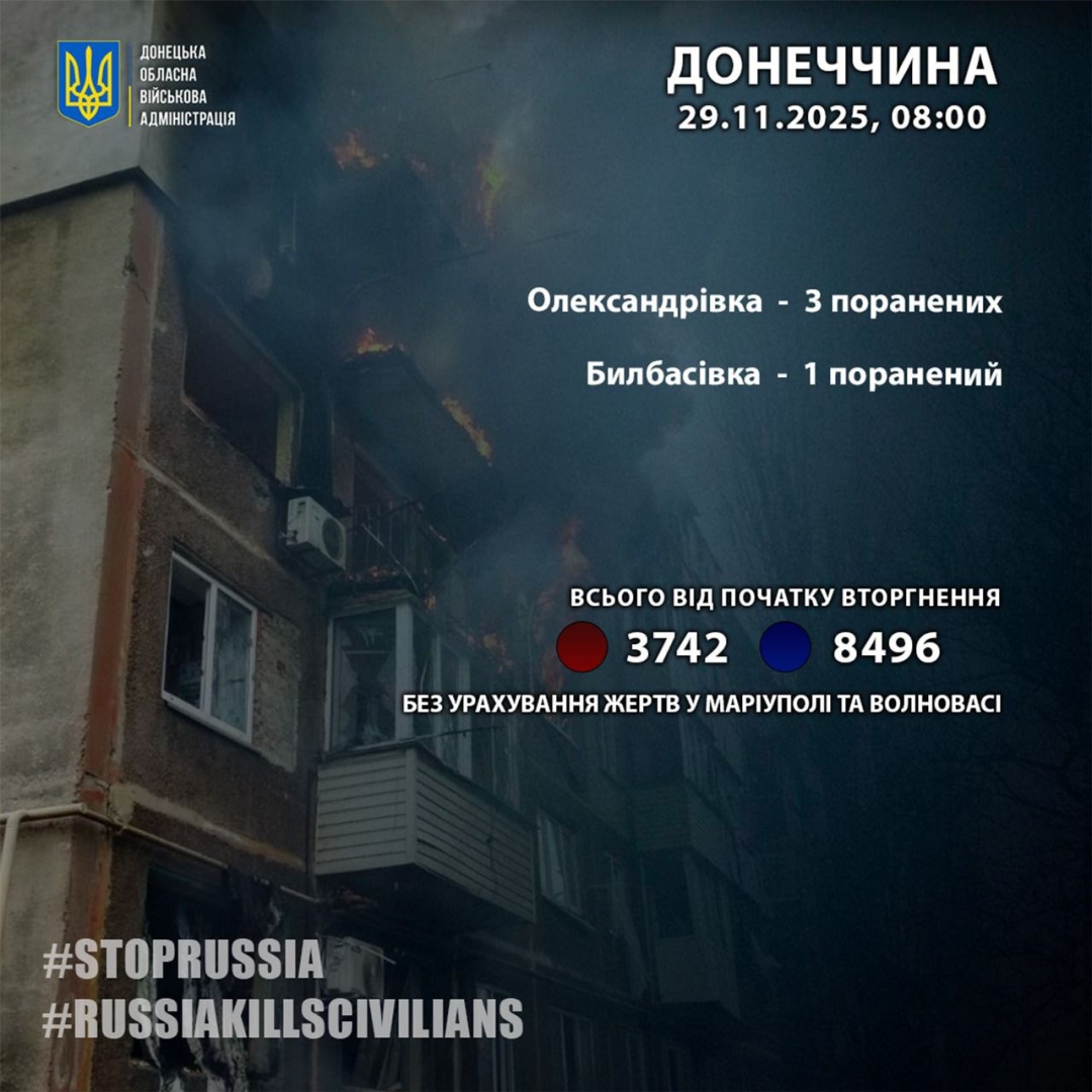 На Донеччині за минулу добу, 28 листопада, четверо людей зазнали поранень внаслідок російських ударів: троє в Олександрівці та одна в Билбасівці.