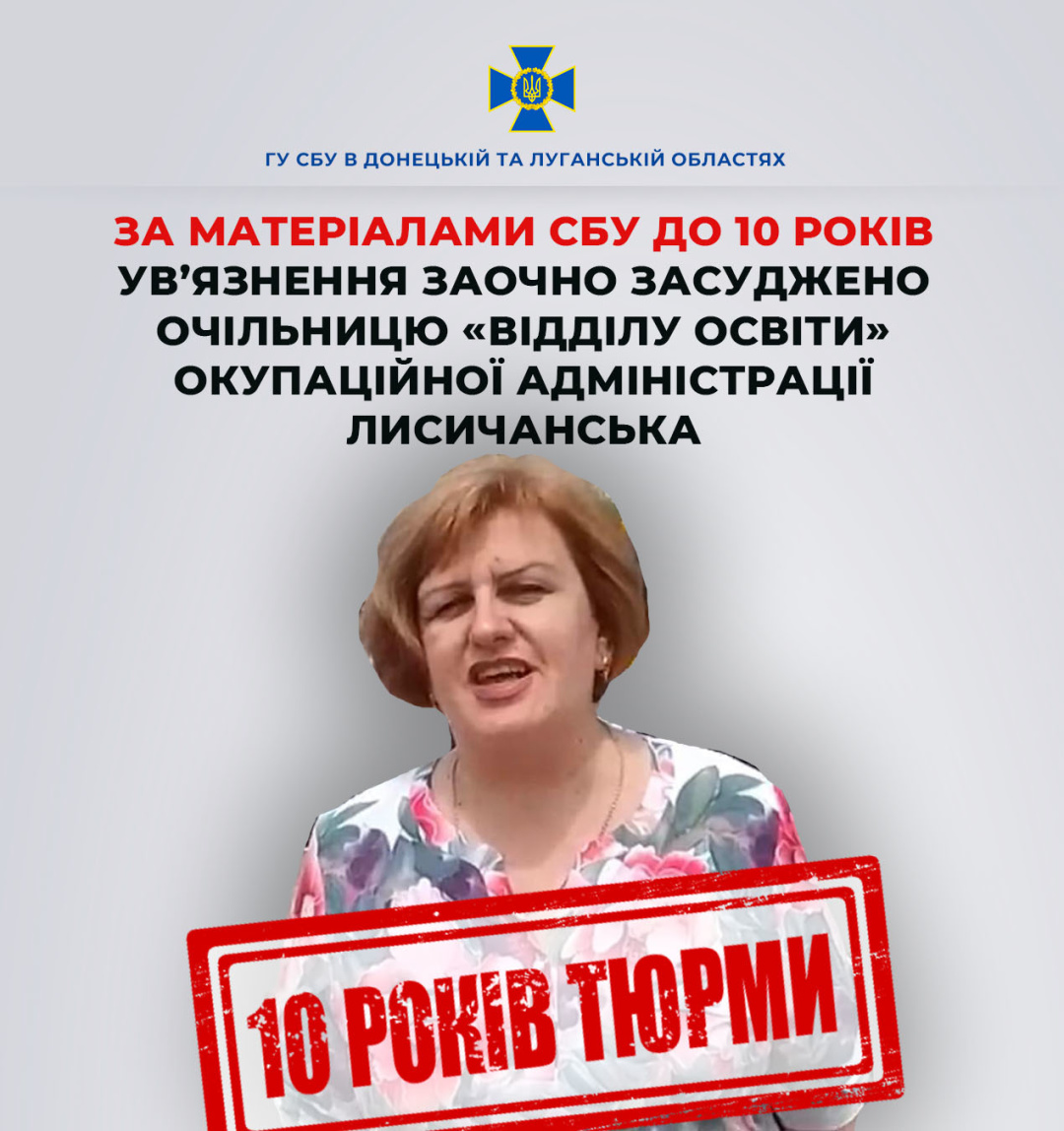 “За матеріалами слідства Служби безпеки до тривалого терміну за ґратами заочно засуджено ворожу поплічницю з Лисичанська. Задокументовано, що одразу після окупації міста вона відкрито підтримала агресора та обійняла посаду «начальника» фейкового «відділу освіти» у місцевій рашистській адміністрації”, - йдеться в повідомленні.
