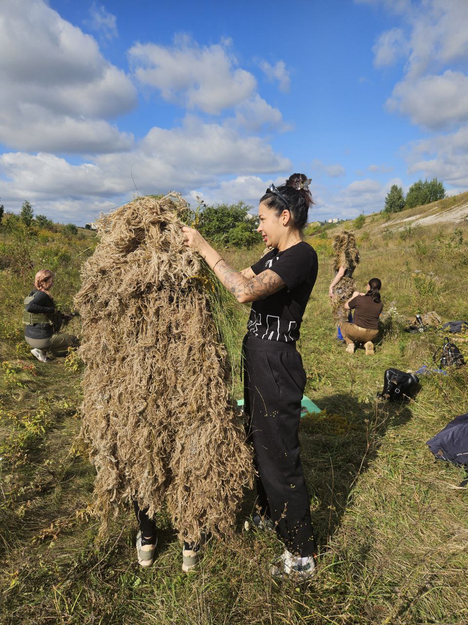 Процес маскування дуже цікавий. Наш інструктор – ветеран Роман (позивний «Маніяк»), воював у Бахмуті, на Запоріжжі. Він поділився і власною маскувальною сіткою, і, звісно, досвідом.