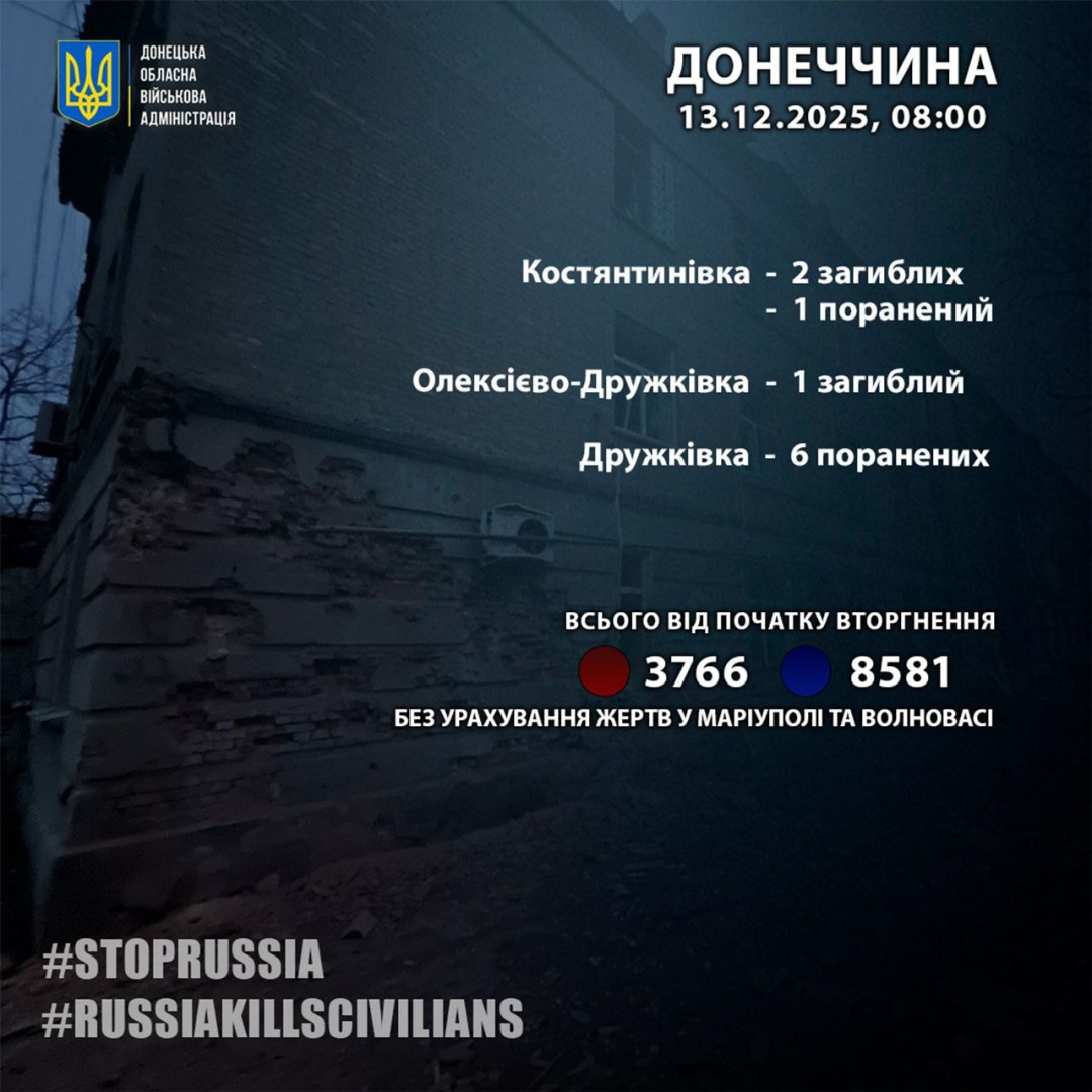 За 12 грудня росіяни вбили трьох жителів Донеччини: двох - у Костянтинівці та одного - в Олексієво-Дружківці. Ще сімох людей в області за добу поранено.