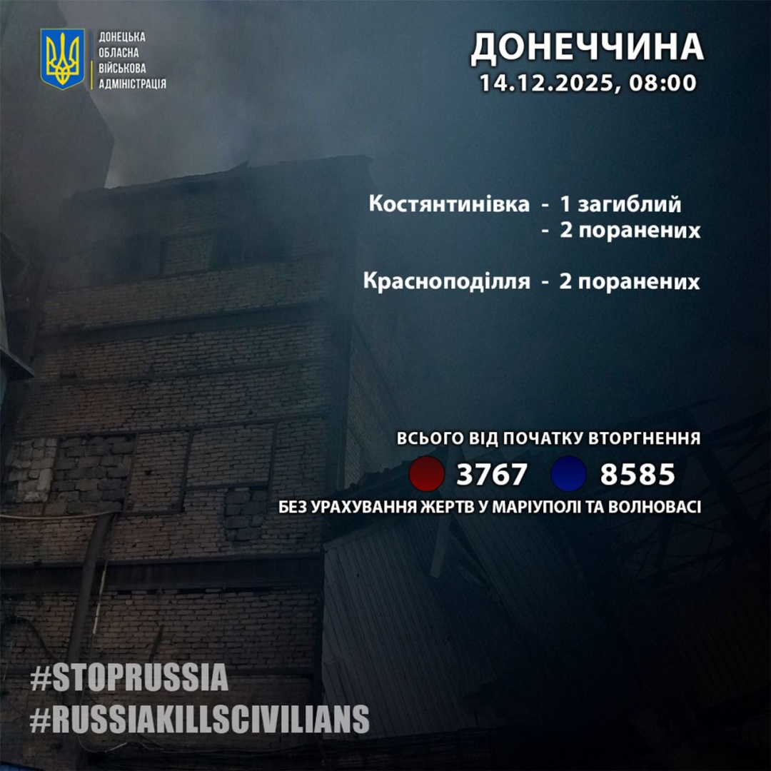 Як повідомляв Укрінформ, росіяни 12 грудня за добу вбили трьох жителів Донеччини, ще семеро людей в області за добу зазнали поранень.