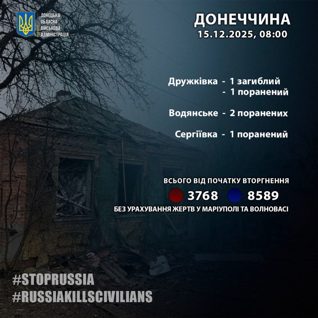 Російська армія за минулу добу, 14 грудня, вбила одного жителя Донецької області, ще чотирьом завдала поранень.