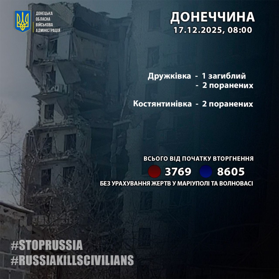 Минулої доби, 16 грудня, російські загарбники вбили одного жителя Донецької області.
