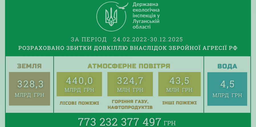 “Щоденні бойові дії на території Луганської області призводять до масштабного руйнування природного середовища. Станом на 30 грудня 2025 року спеціалістами Державної екологічної інспекції у Луганській області зафіксовано та розраховано збитків довкіллю на загальну суму 773 232 377 497 грн”, - ідеться в повідомленні.