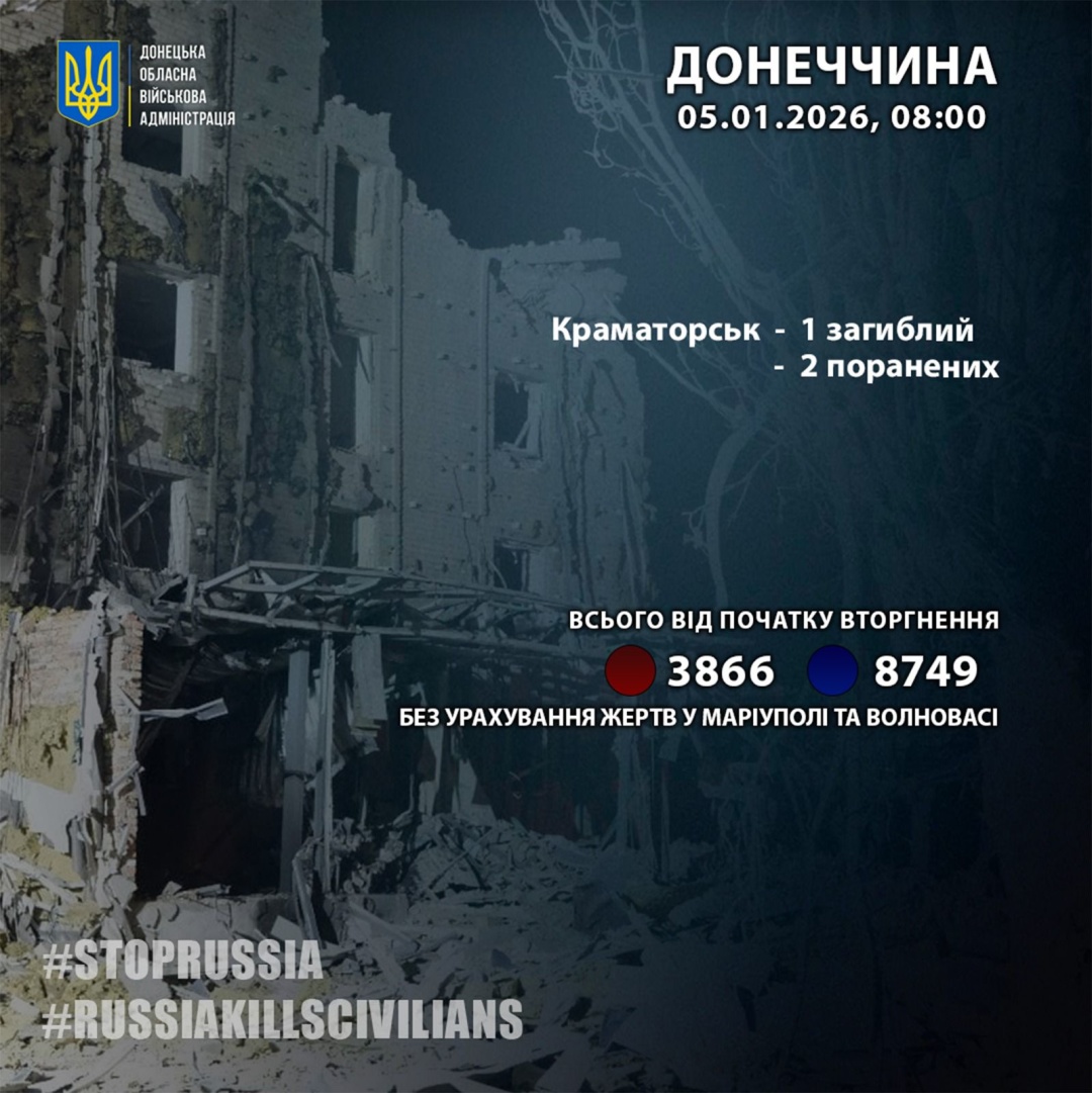 У неділю, 4 січня, росіяни вбили одну людину у Краматорську. Ще двоє людей в області за добу дістали поранення.