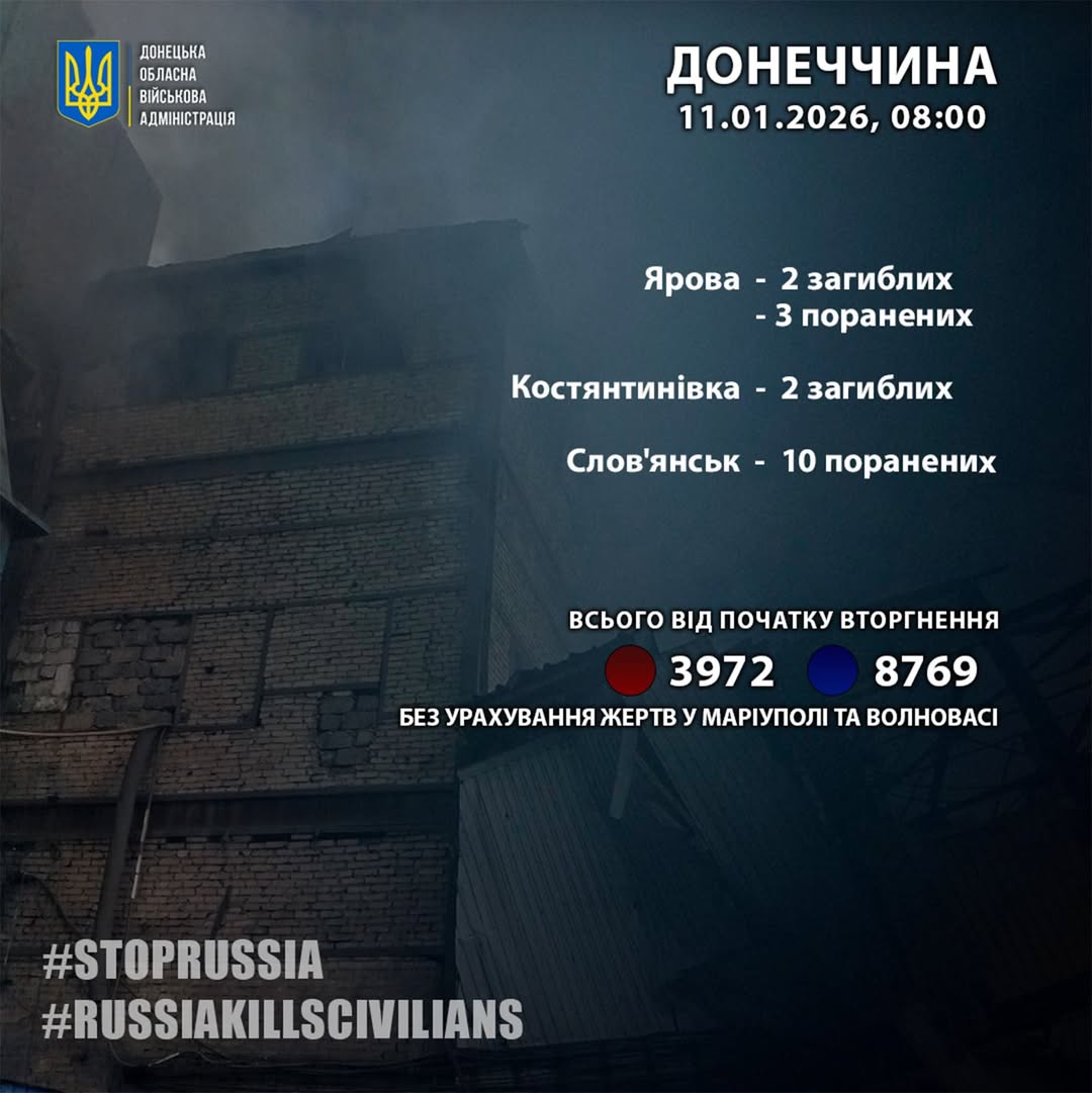 Як повідомляв Укрінформ, минулої доби, 9 січня, внаслідок російських обстрілів Донеччини загинув мирний житель та ще двоє цивільних дістали поранення.