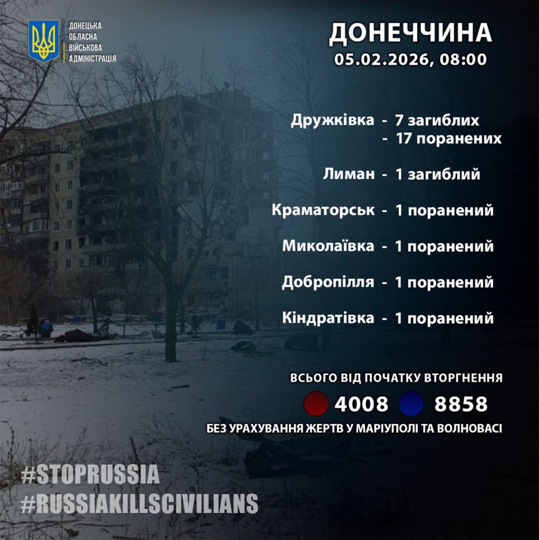 Минулої доби, 4 лютого, російські війська вбили вісьмох жителів Донецької області та ще 21 поранили.