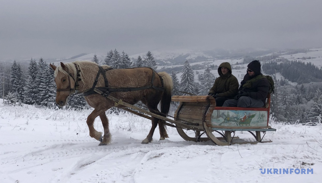 Нас зустрічає голова Конятинської громади Олексій Скрипчук. Люб’язно запрошує пересісти на більш пристосований до гірських засніжених доріг транспорт – дві кінські підводи й сани. Наступні п'ять кілометрів дорогою вгору до центру села їдемо «із вітерцем». Помічаю, що коні «перевзуті» у зимові підкови із шипами. У таких обладунках тваринам легше долати слизькі ділянки шляху. Погоничі кажуть, що ці коні звикли підніматися засніженими горами. Зауважують, що чим доросліша тварина, тим більше має досвіду, отже, краще долає різкі підйоми в горах.
