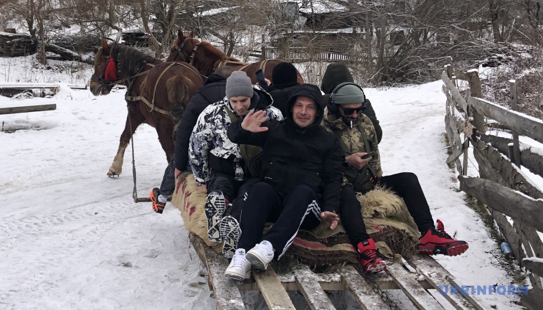На вершині пагорба, звідки відкриваються справді неймовірні краєвиди на зимові гори, організували швидкий гуцульський перекус: домашній хліб, сало, часничок із цибулькою та по чарочці місцевої наливки. Погоничі поклали сіна коням. Військові фотографуються на тлі краєвидів, телефонують близьким і діляться враженнями. Знайомлюся з військовослужбовцем 43 бригади Євгеном М’ясоїдом. Він родом із Дніпропетровщини, наприкінці серпня 2025 року отримав поранення на фронті від ворожого дрона. У його тілі досі багато уламків, перебиті нерви, нога повноцінно не працює, є проблеми зі слухом. Розповідає, що за останні п'ять місяців, окрім лікарняних палат і процедурних кабінетів, майже нічого не бачив. І коли ми піднялися на засніжену гору на запряжених кіньми санях, його емоціям не було меж.
