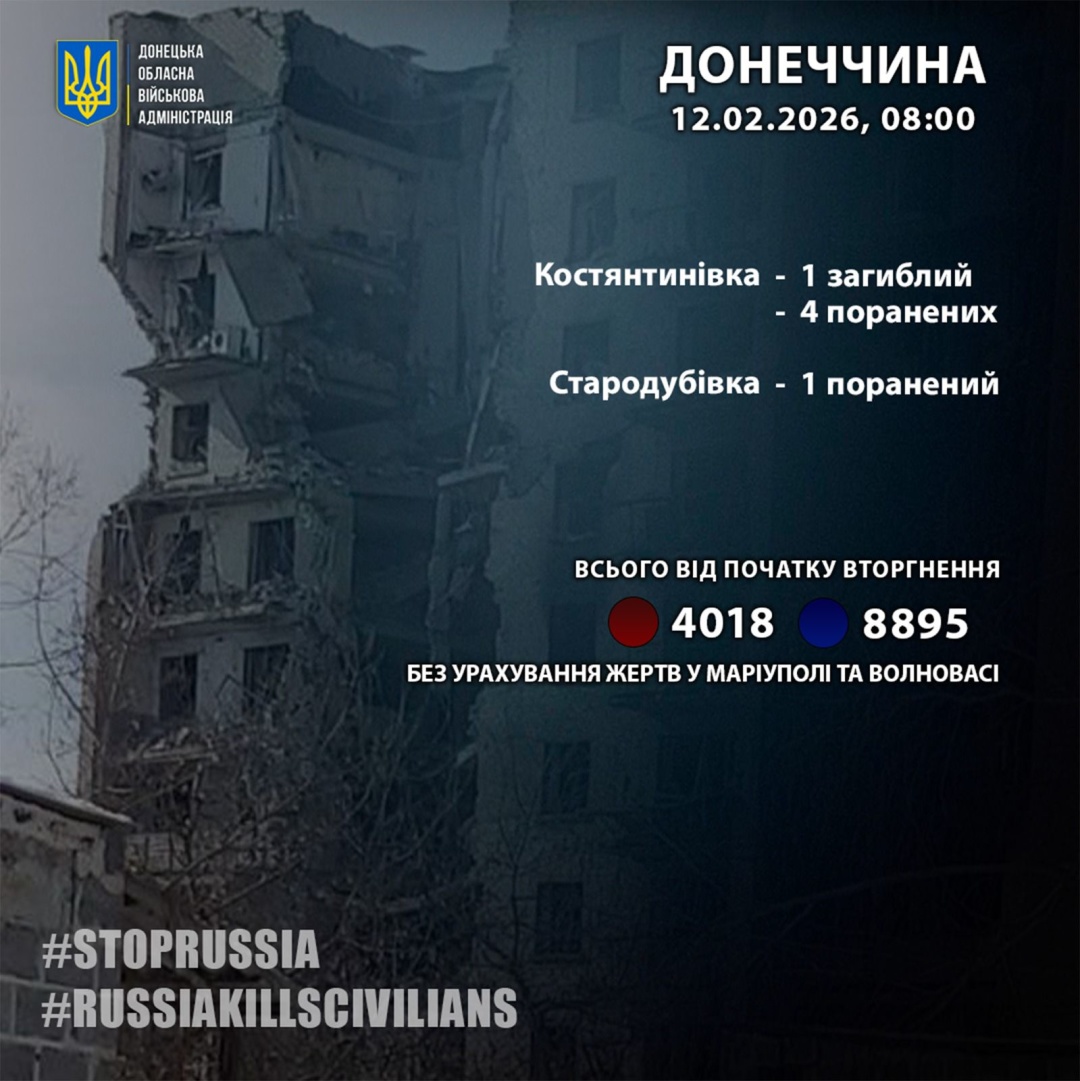 За його словами, 11 лютого росіяни вбили одну людину і поранили чотирьох людей у Костянтинівці. Ще одна людина дістала поранень у Стародубівці.