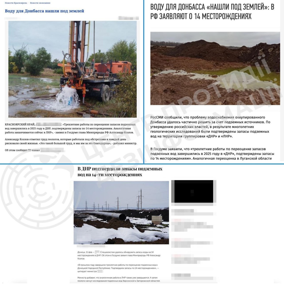 «Глава Мінприроди РФ Олександр Козлов заявив про нібито "виявлені запаси підземної води" у Донецькій області - на 14 родовищах після трьох років досліджень. Російські пропагандистські медіа також заявляють про "переоцінку запасів підземних вод" на окупованій Луганщині та про плани щодо проведення досліджень у Херсонській та Запорізькій областях. Водночас у проблемах водопостачання традиційно звинувачують Україну, замовчуючи наслідки власної окупації та руйнування інфраструктури», - йдеться у повідомленні.