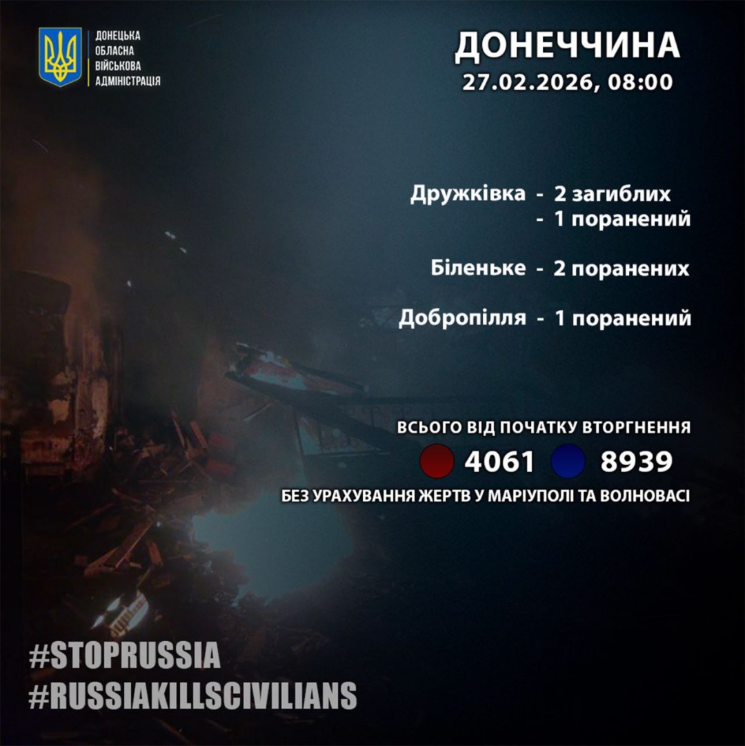"За 26 лютого росіяни вбили двох жителів Донеччини: у Дружківці. Ще 4 людини в області за добу дістали поранення", - ідеться у повідомленні.