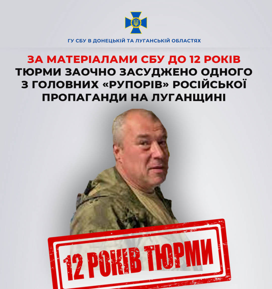 «На підставі доказової бази Служби безпеки судовий вирок отримав колаборант, який веде системну інформаційну діяльність з підтримки та виправдовування агресії РФ проти України. Засудженим є засновник та головний редактор луганської газети «ХХІ век», депутат псевдопарламенту «ЛНР» та учасник так званої «СВО» Юрій Юров», - ідеться в повідомленні.