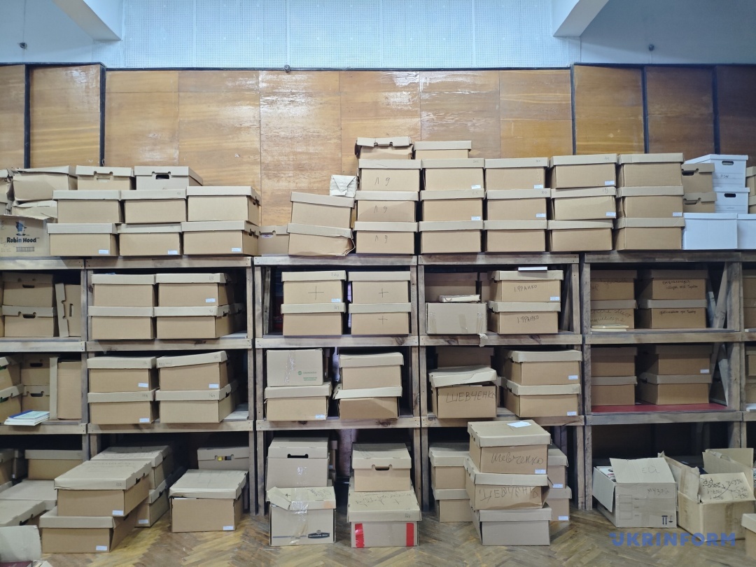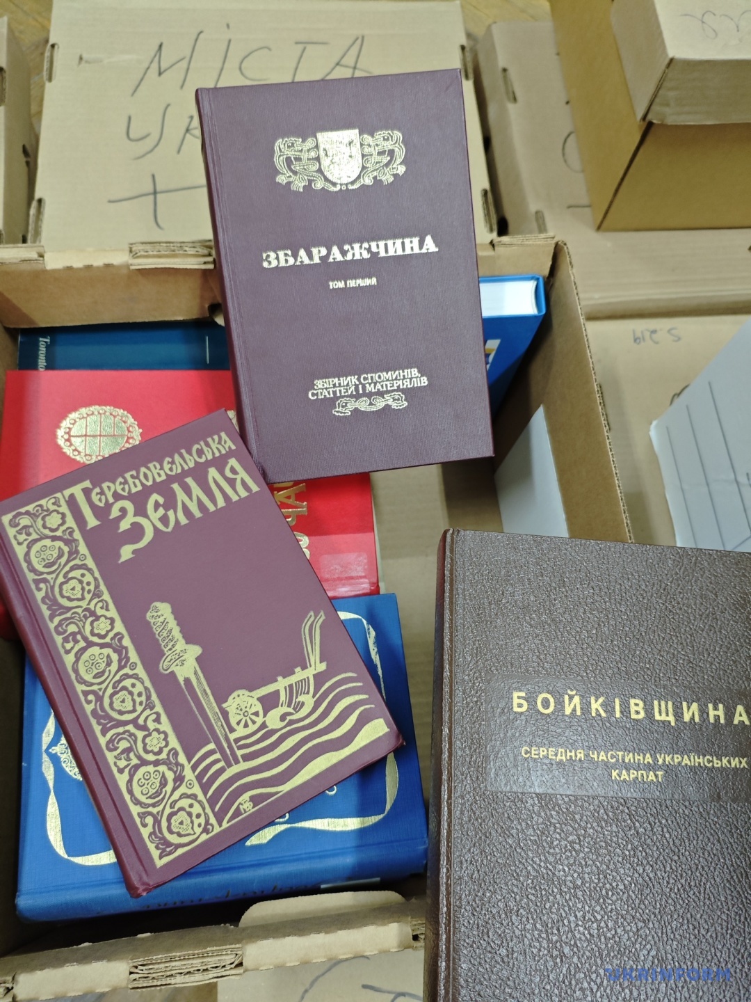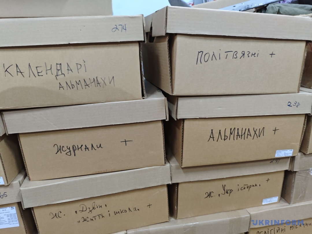 Уже після доставляння в Тернопіль коробки з виданнями кілька днів переглядали та упорядковували головна зберігачка фондів музею Оксана Ваврик та зберігачка фондів Ганна Галунка. Разом із ними вирушаю у приміщення, де зберігаються перевезені книги й періодика. У кожній підписаній коробці – дбайливо складена література. Усе розподілене відповідно до тематики.