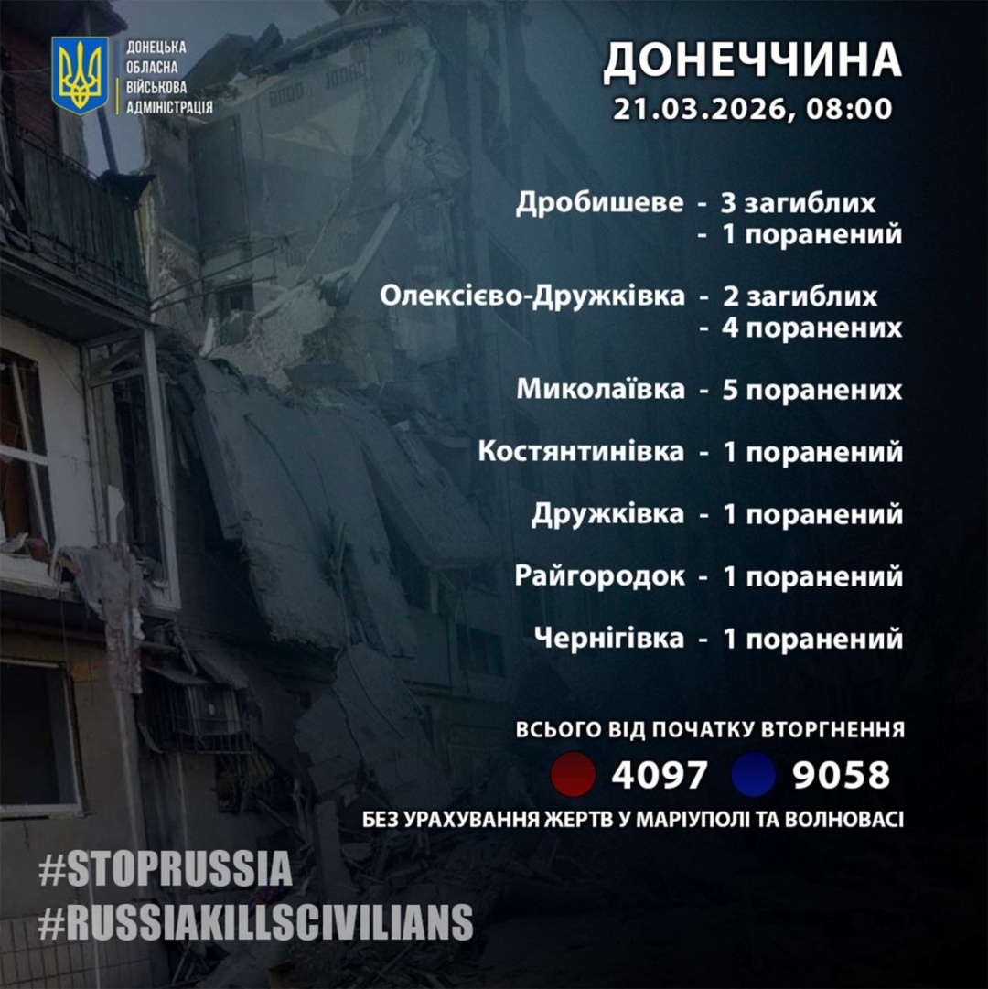 Російські загарбники минулої доби, 20 березня, вбили п’ятьох і поранили 14 жителів Донецької області.