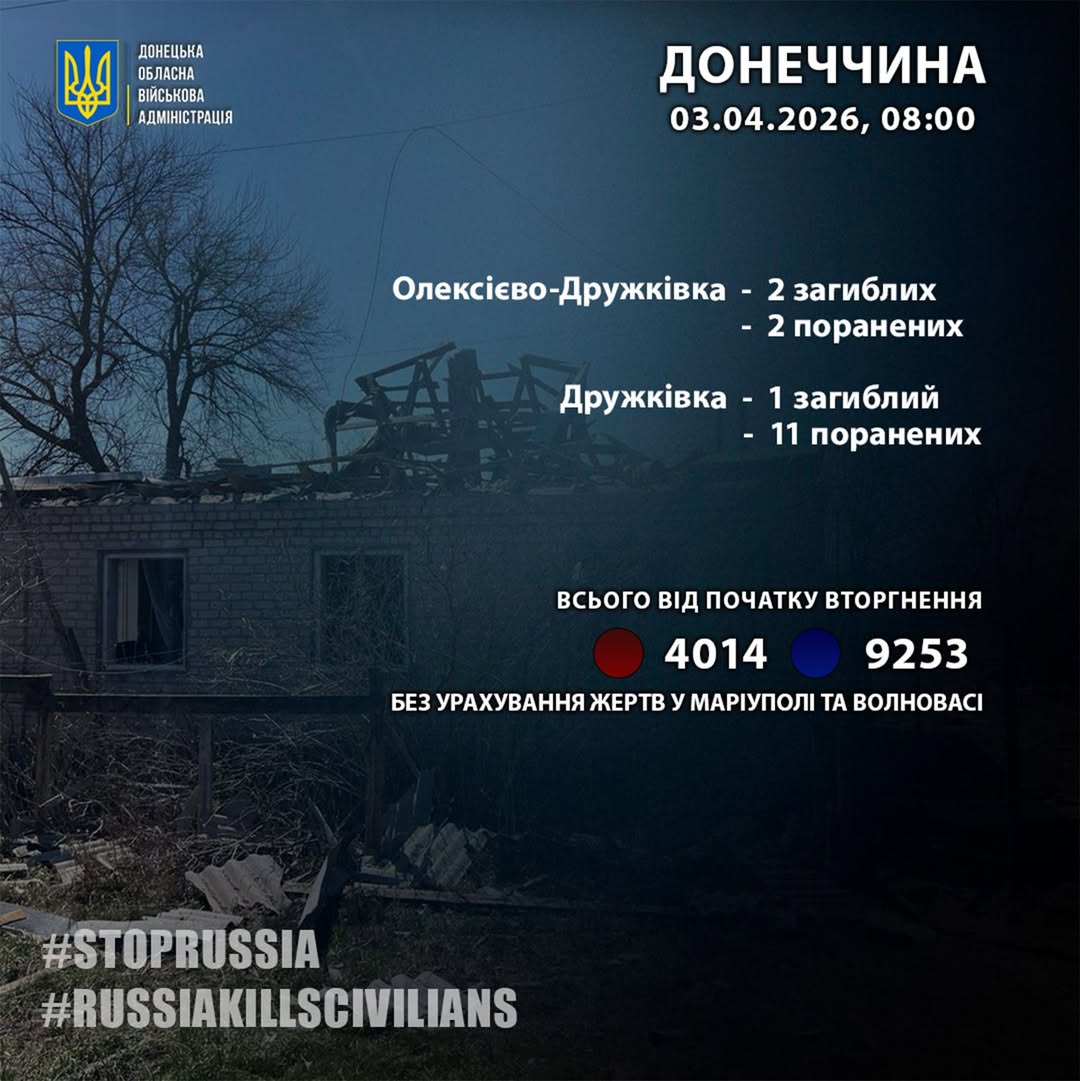 Російські загарбники минулої доби, 2 квітня, вбили трьох жителів Донецької області і ще 13 людей поранили.