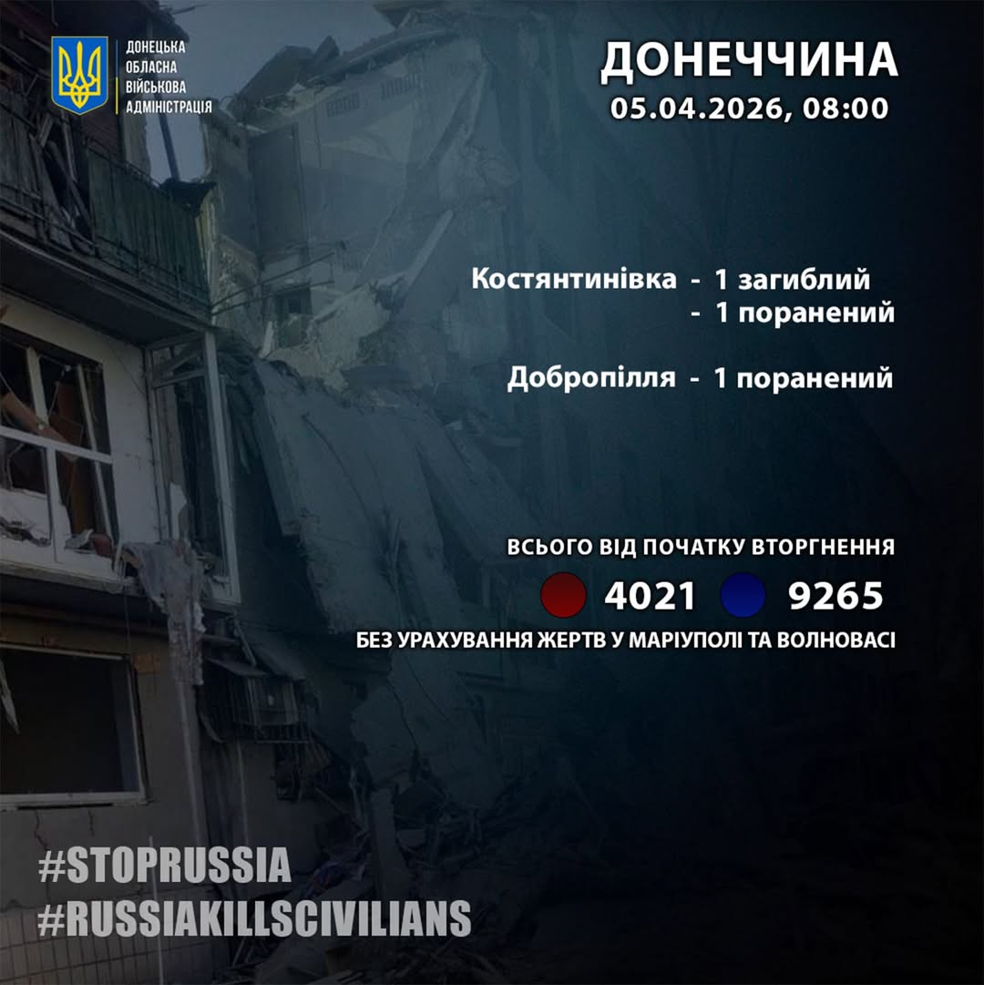 "За 4 квітня росіяни вбили 1 жителя Донеччини: у Костянтинівці. Ще 2 людини в області за добу дістали поранення", - написав Філашкін.