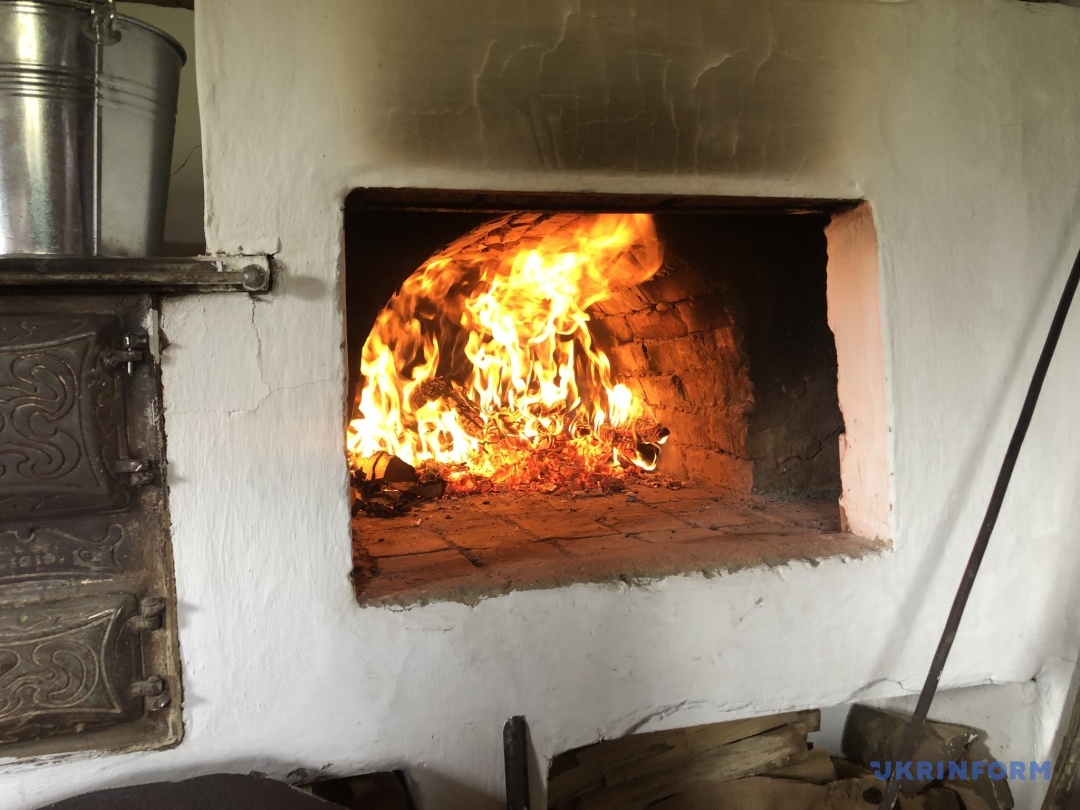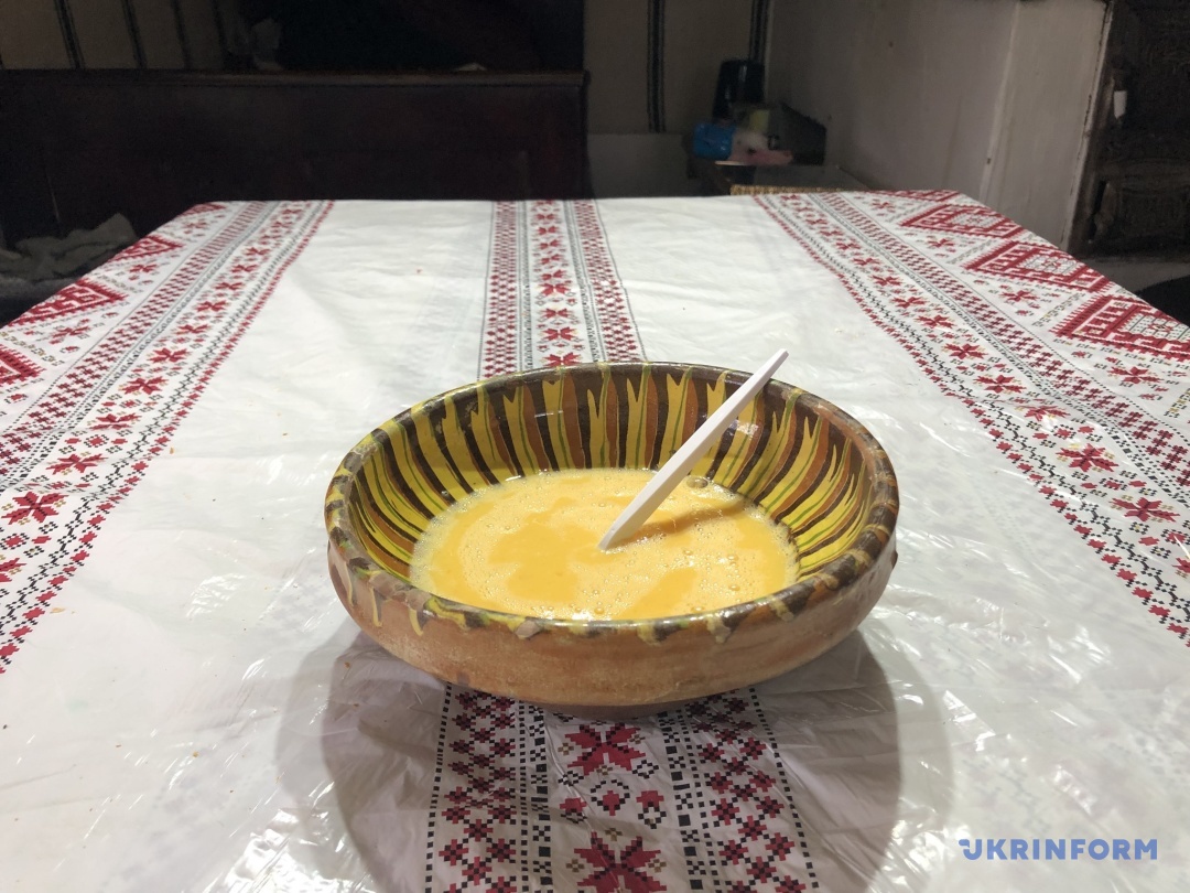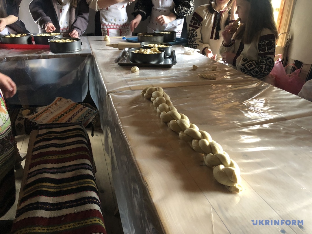 Захід відбувався в одній із сільських хатин музею. Коли я зайшов усередину, відчув надзвичайно тепле повітря, яке йшло від розтопленої у кімнаті грубки домашньої печі. Біля неї стояла дерев’яна посудина із замішаним тістом, накритим чистим рушником. За столом – перші учасники майстер-класу, які й допомагали місити. За словами пані Світлани, перш ніж братися за виготовлення великоднього хліба, кожна господиня із самого ранку читає молитву та вмивається. Спершу слід приготувати опару, яку ще називають «розчи́ни».