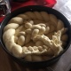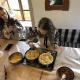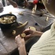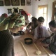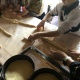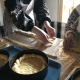 Поки тісто «підходить» до потрібного розміру, учасники змащують форми для випікання домашньою олією. Потім починають виробляти із тіста частини майбутньої паски. Майстриня виділяє кожному учаснику по невеликому шматку тіста, яке починають розкачувати дерев’яними качалками. Це буде майбутня основа наших пасок, дехто називає її «підошва». Має вийти рівномірне коло, яке потім поміщають на дно форми, не торкаючись її стінок.